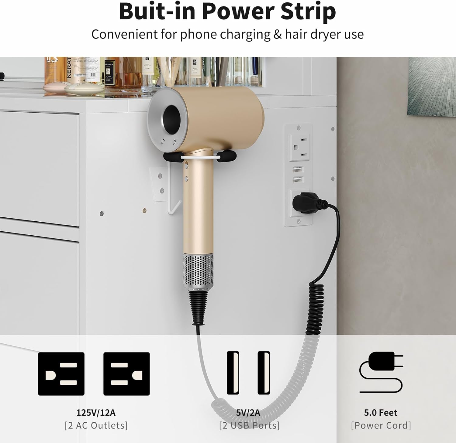 - Convenient Power StationοΌStay charged and connected with the built-in power outlet, featuring a dedicated hairdryer rack along with 2 standard plug sockets and 2 USB ports. This makeup vanity allows you to power up your devices or styling tools while you effortlessly create your perfect look