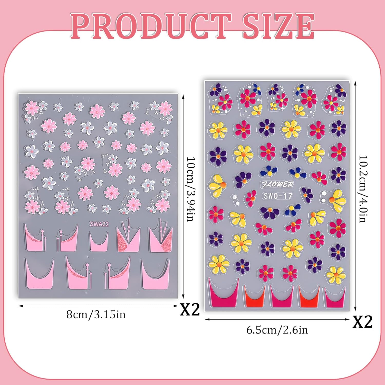 - ăFlower Nail Art StickersăYou will get 4 sheets 3d flower nail stickers for nails salon, many cute flower pattern for you to choose, colorful floral nail designs, and satisfy your rich imagination of nail DIY.