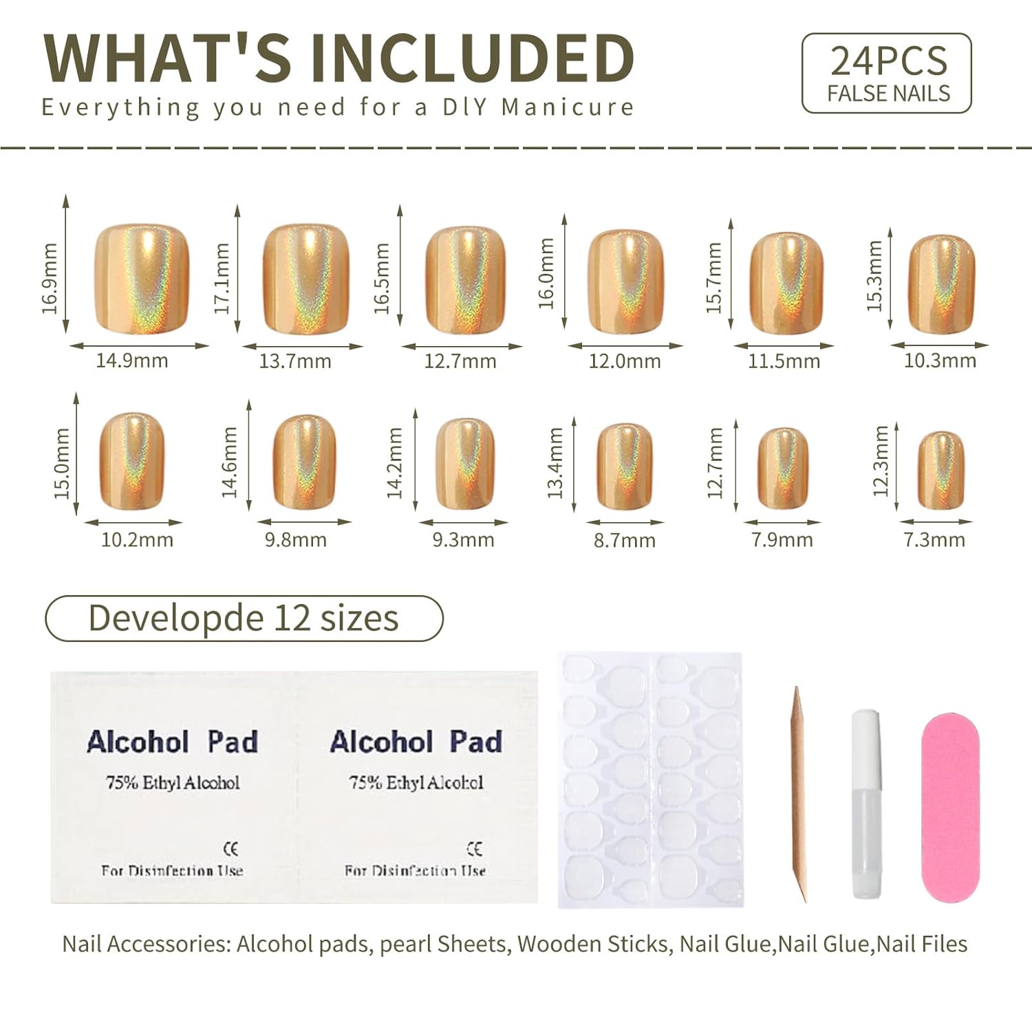 Gold Holographic Press On Nails, Short Chrome Glue On Nails for Women, Metallic Golden Fake Nails with Iridescent Glow, Press On Nails Short Square Shape, Color-Shifting Aurora Effect, 24 Pcs