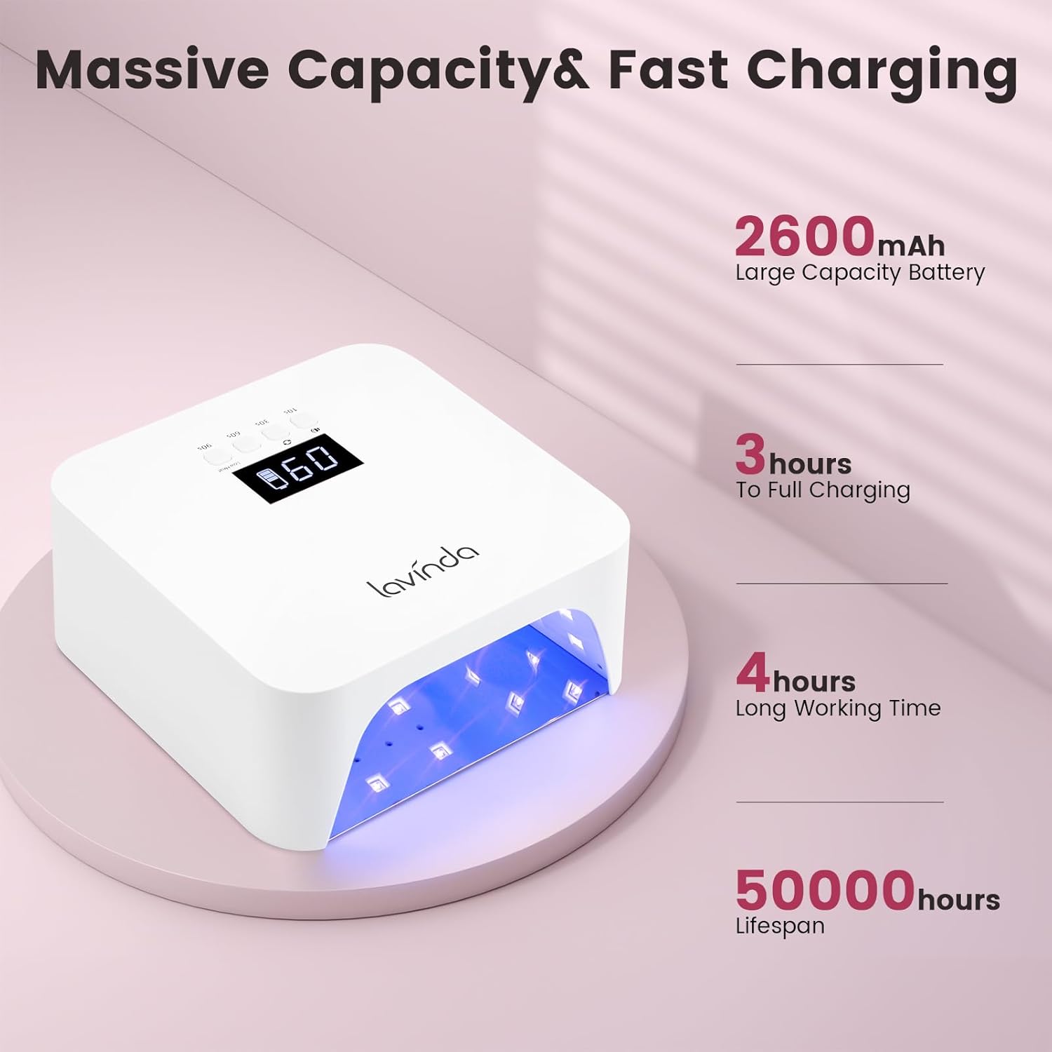 Lavinda 48W UV LED Nail Lamp, Rechargeable Cordless UV Light for Gel Nails LED Nail Dryer with Auto Sensor, 4 Timer Settings & LCD Display, Fast Curing Light All Gel Polish for Home Salon Use