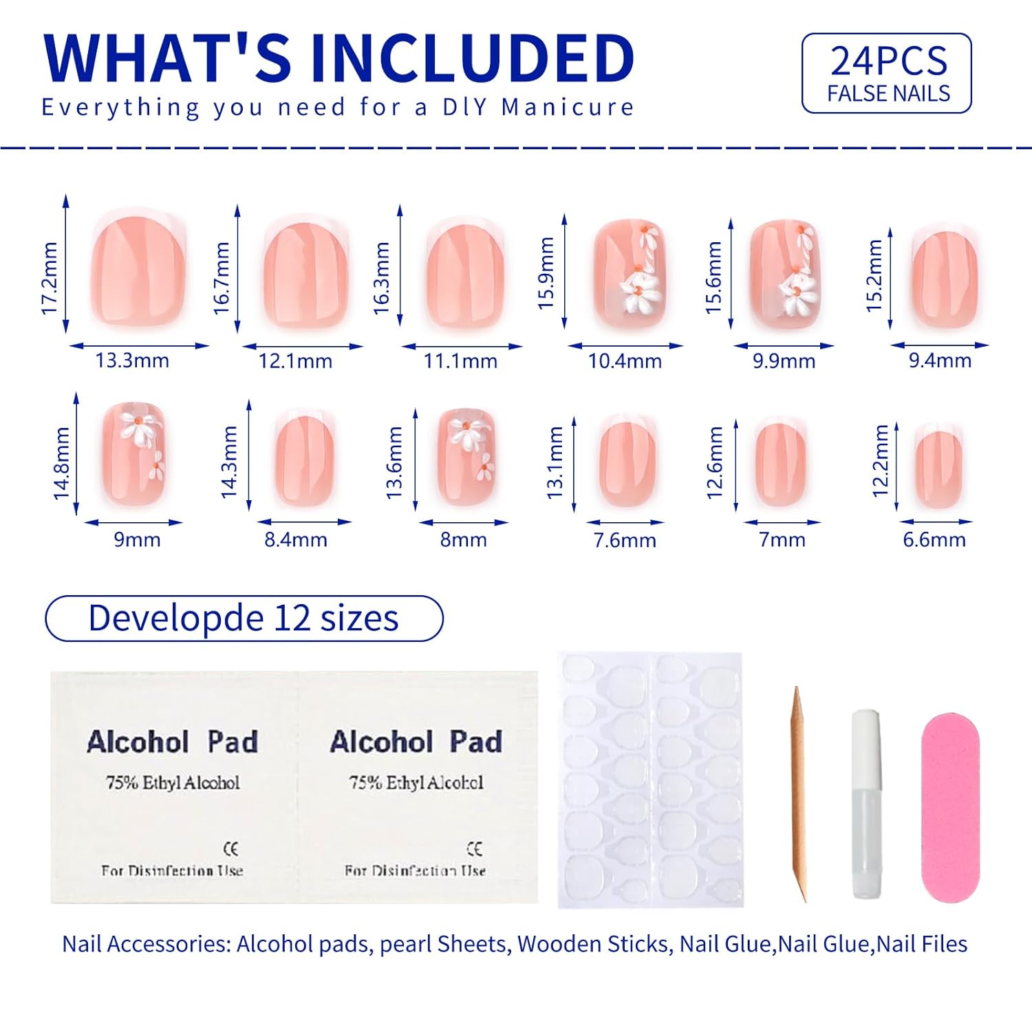 - Package Includes: 24 pcs stick on false glue on nails kit, each box includes 24 short press on nails, 1 sheet of 24 sticky nail pieces, 1 cuticle stick, 1 double sided nail file and gel press on nails cleaning pads, a small tube of nail glue๏ผAll the tools you need to apply the nails are included in one set