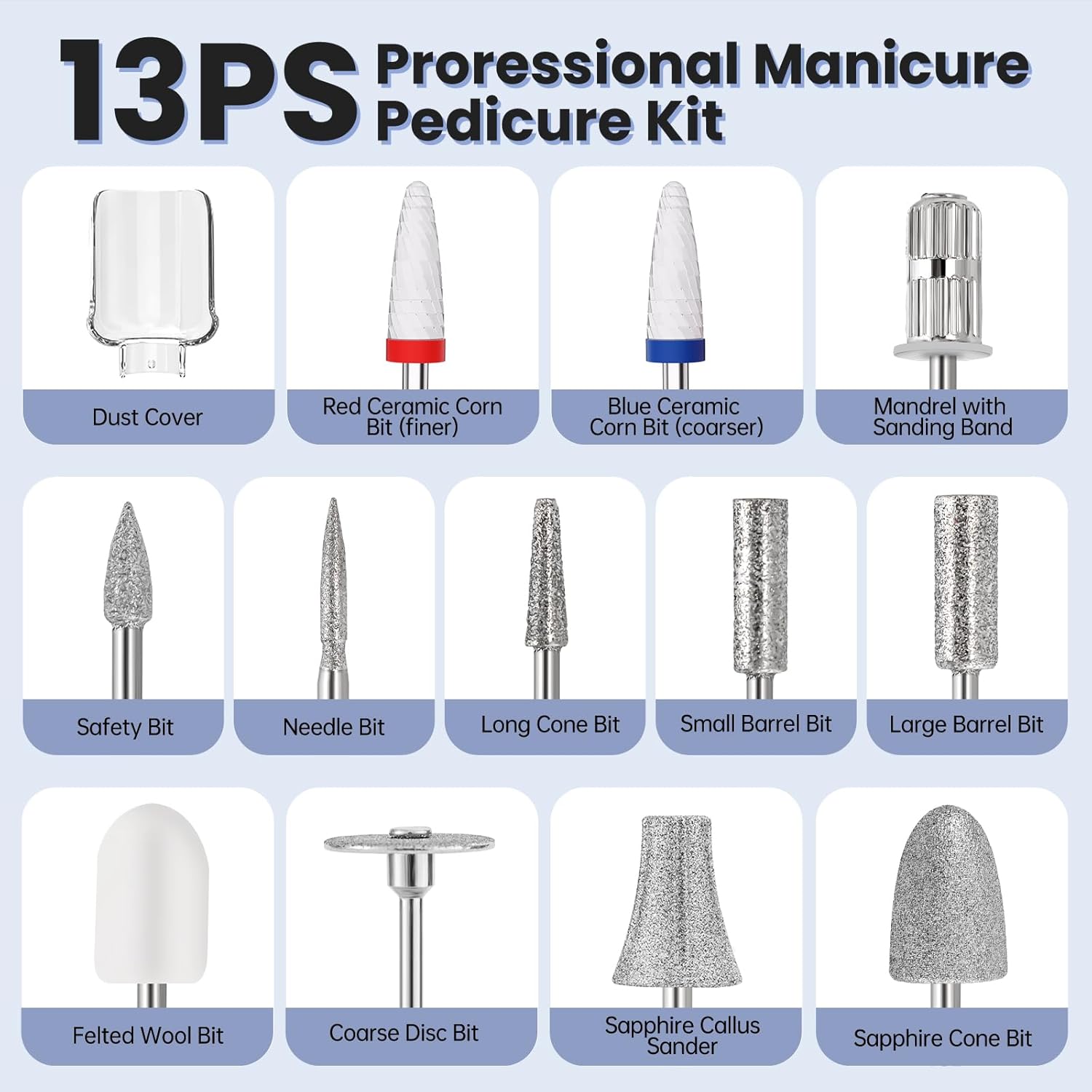 - 【Professional Hand & Foot Nail Care】With 13 accessories, including various grinding heads and LED light and lid tools, this drill nails kit meets all your nail care needs, from filing and shaping nails to removing calluses, and even works for gel nails. Enjoy salon-quality treatments at home!