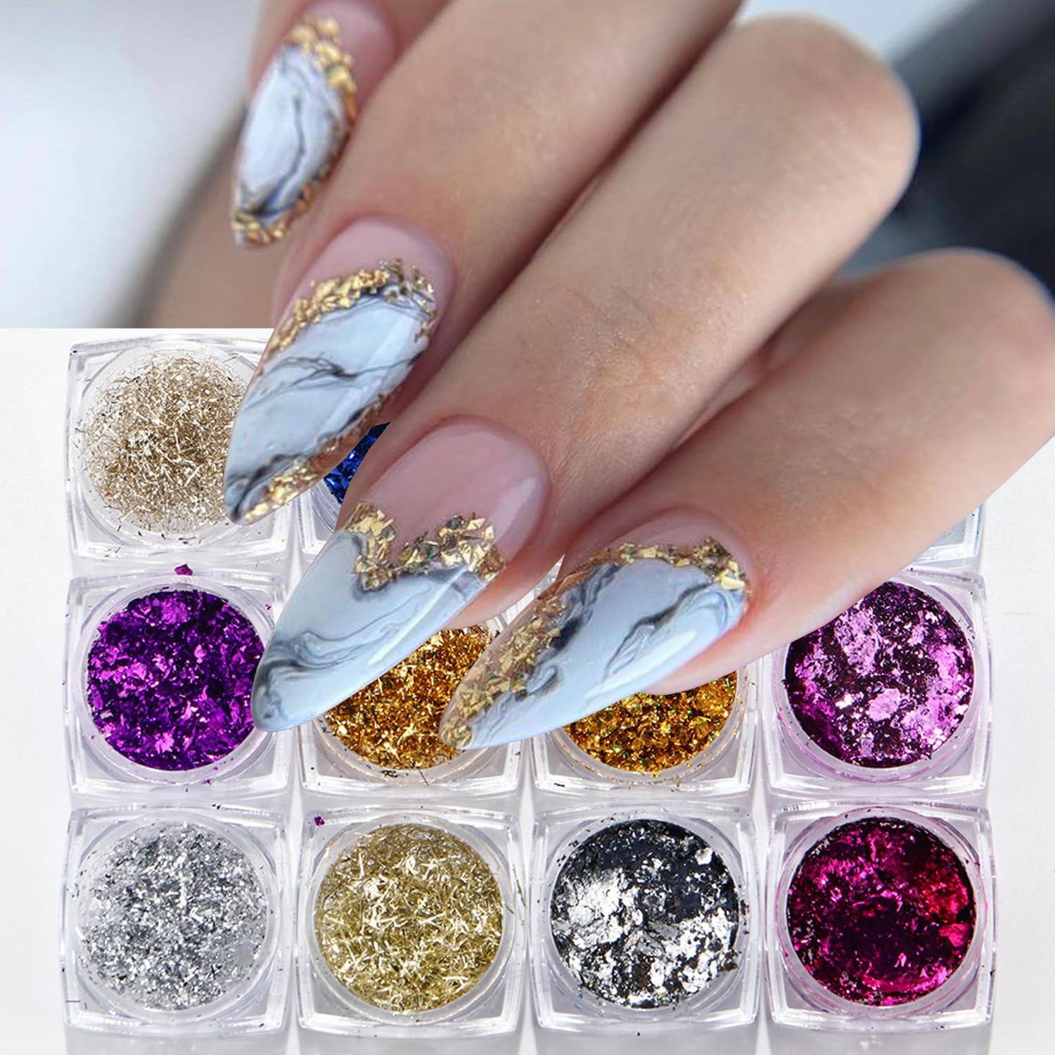 - Package: You will get 12 colors/12 bottles gold foil nail art sequins for acrylic nails supply,glittering sequins design and satisfy your rich imagination of nail DIY.