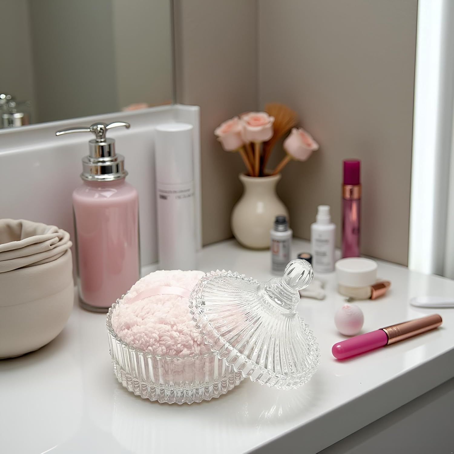 - 【Durable & Easy to Clean】 This glass powder puff container is made of high quality glass material, beautiful and durable. This product is not a sealed jar, which is easy to clean and take care of daily, it doesn't take up too much space, but can store your daily trinkets and keep your items organized