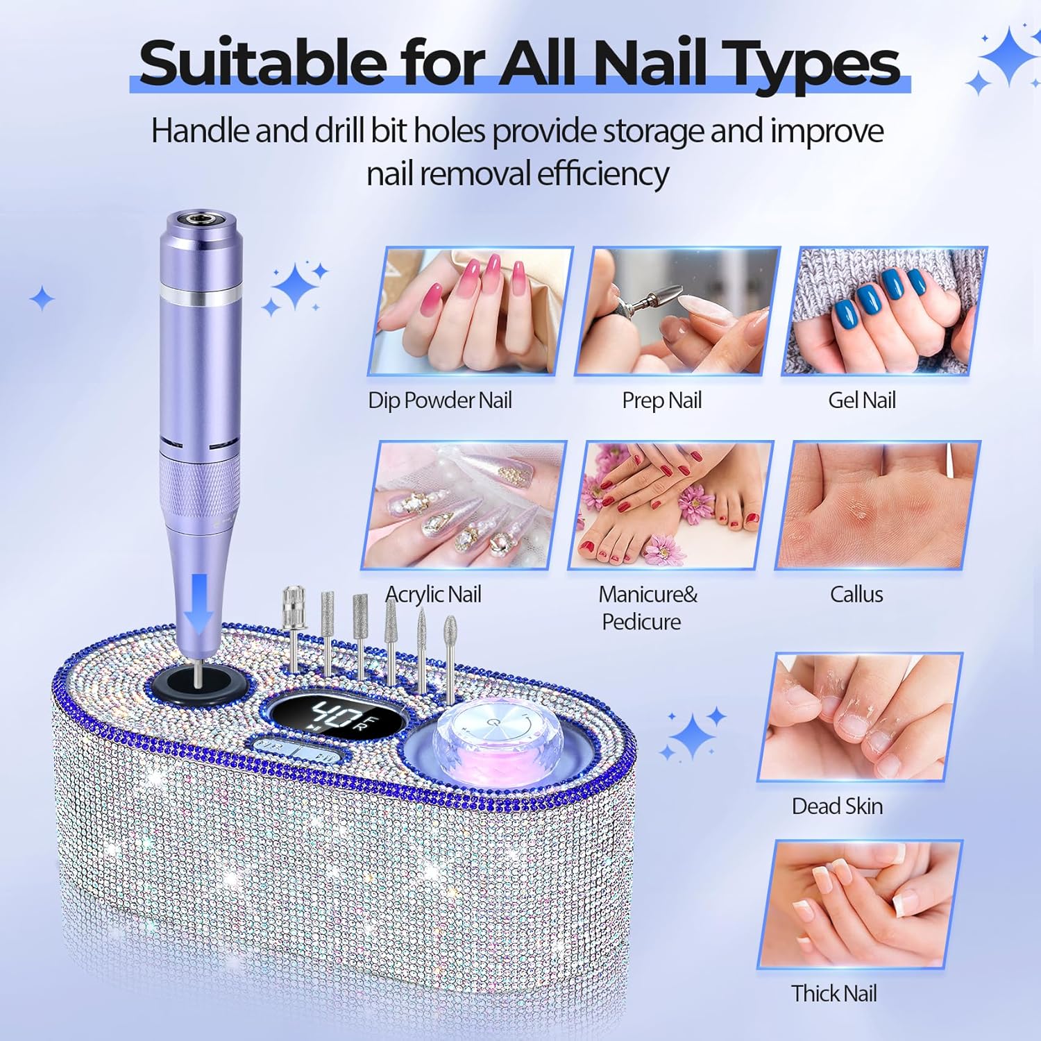 - 40000RPM Powerful Nail Drill Machine: Enjoy the fun of a bling bling AB Diamond that is covered with the drill body! JOSGLOI professional nail drill has a high-torque motor that delivers stable current power and speed, ensuring smooth operation even at high speeds (up to 40,000 RPM). Stable current and movement is a prerequisite for high speed, even the hardest nails can be easily handled. (Note: The JOSGLOI electric nail files are not rechargeable model)