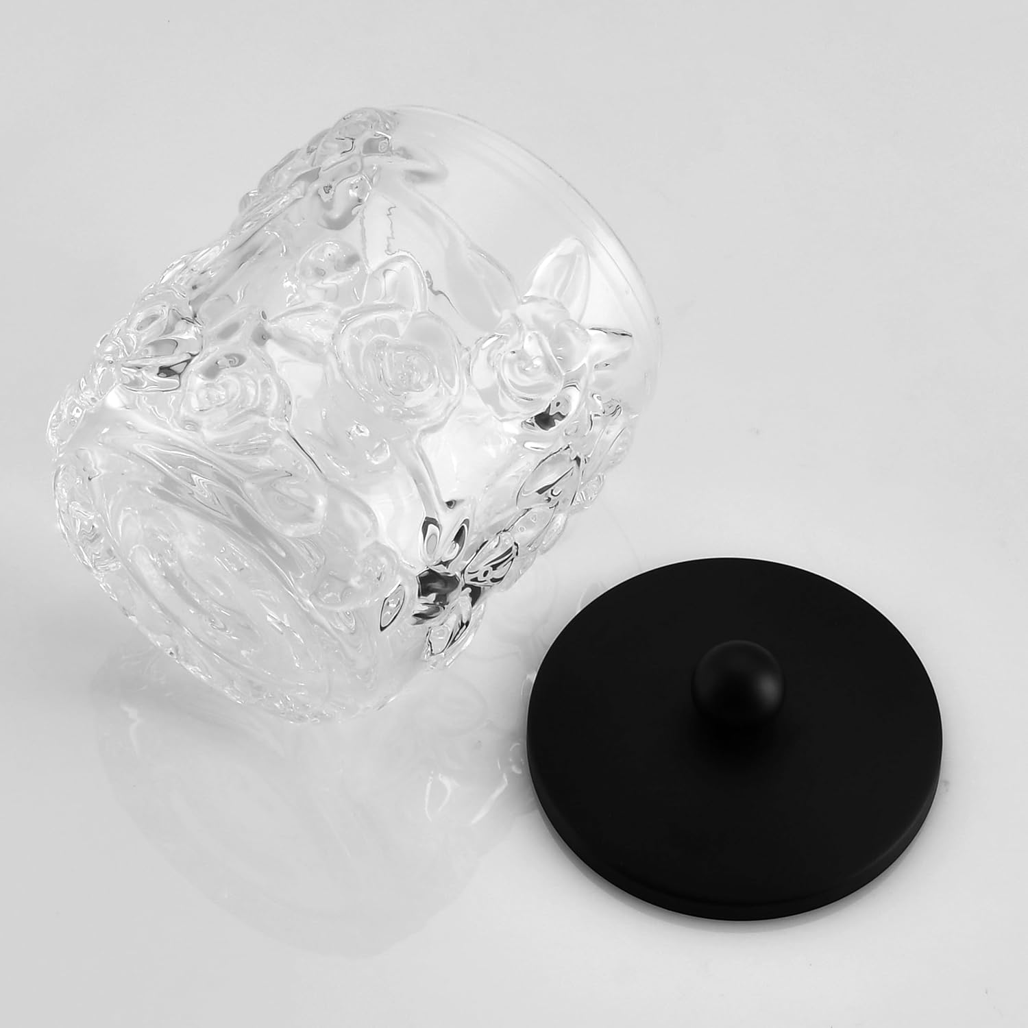 Home Glass Cotton Jar Holder Matte Black Lid, Elegant Bathroom Storage Canister for Qtips, Cotton Balls, Floss, Makeup Organizer, Vanity Bathroom Organization (UPDATED BLACK)
