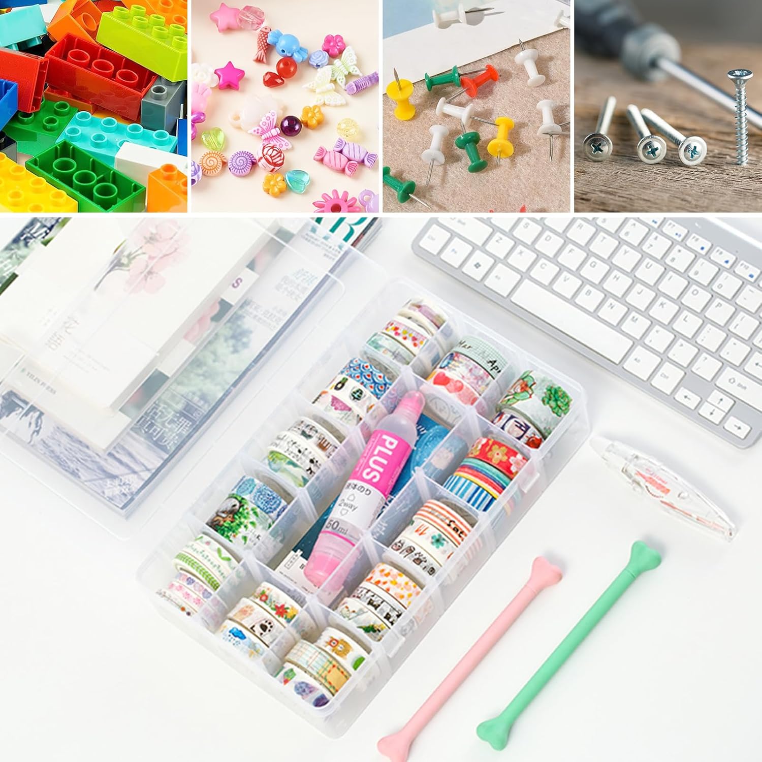 - Wide Applications: The plastic organizer box is great for organizing and storing small items, like jewelry, earrings, necklace, rings, cosmetics, threads, beads,crafts, pills, fishing tackles, electronic components, nails, DIY crafts, etc