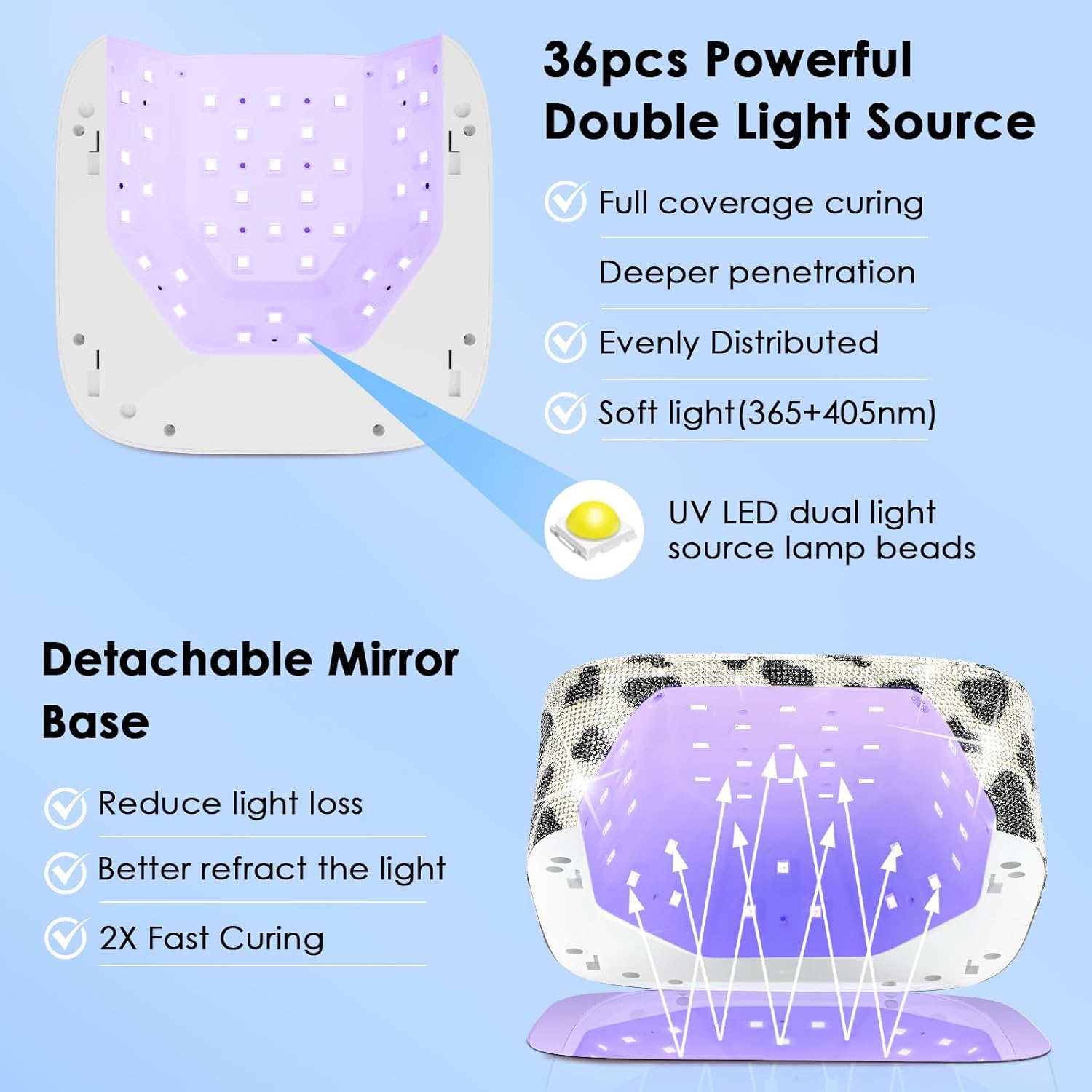 - ๐ ๐๐ฌ๐ญ ๐๐ซ๐ฒ๐ข๐ง๐ ๐๐๐ฅ ๐๐๐ข๐ฅ ๐๐จ๐ฅ๐ข๐ฌ๐ก: The 80W nail dryer features 36 dual-light source beads, UV light shines from all directions and the removable reflective mirror base to better reflect the light for fast drying of gel nail polish. The light is soft (365 nm + 405 nm), gentle on the eyes and prevents hand darkening. It is ideal for DIY nail enthusiasts and salon level manicurists.