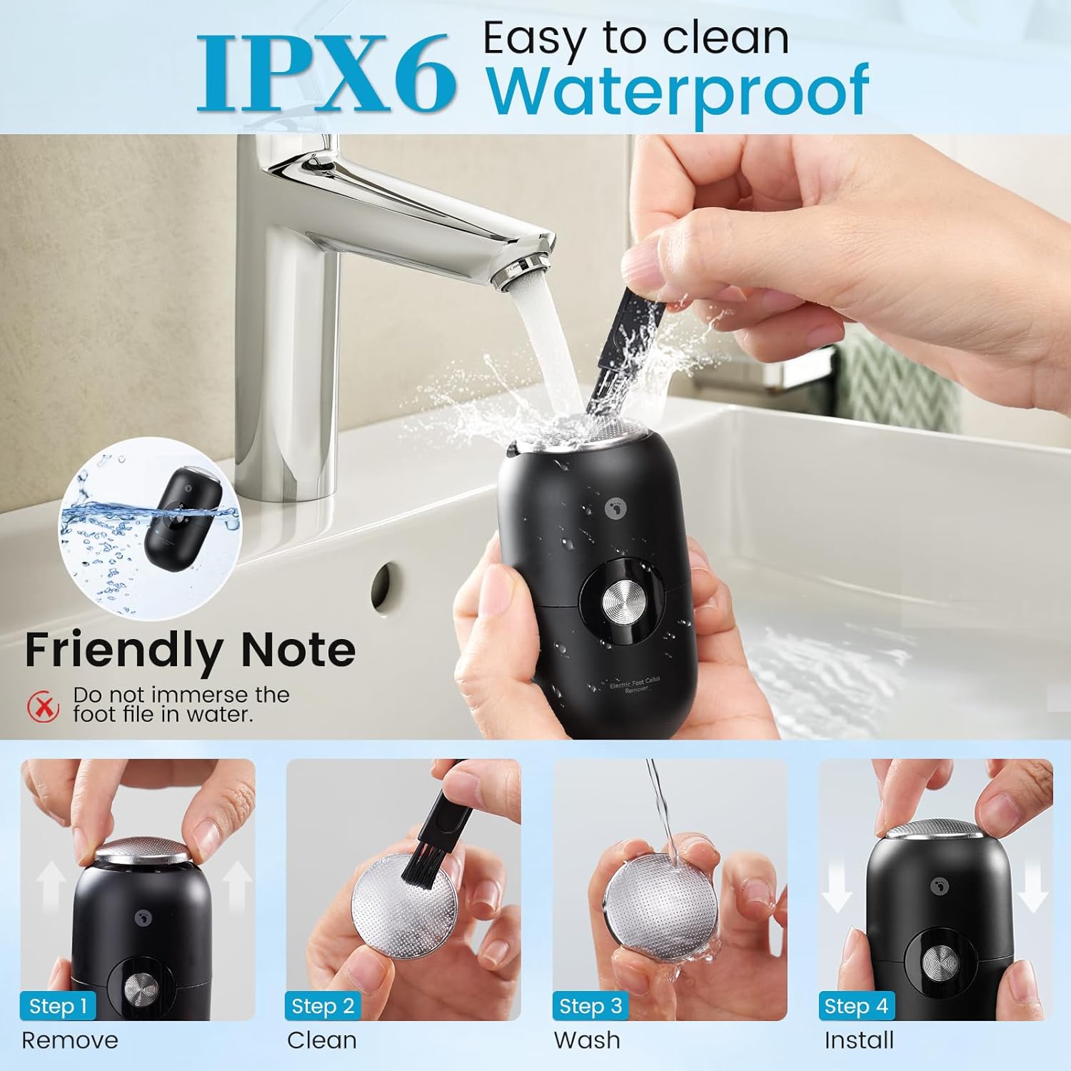 - IPX6 Waterproof Foot File-Wet or Dry Use: The high-speed grinding head removes calluses from dry or wet feet with a light touch—no need for heavy rubbing . After use, simply rinse it under the faucet; debris washes away instantly, eliminating the hassle of manual cleaning. Note: Keep it away from the charging port to avoid soaking and extend its lifespan.