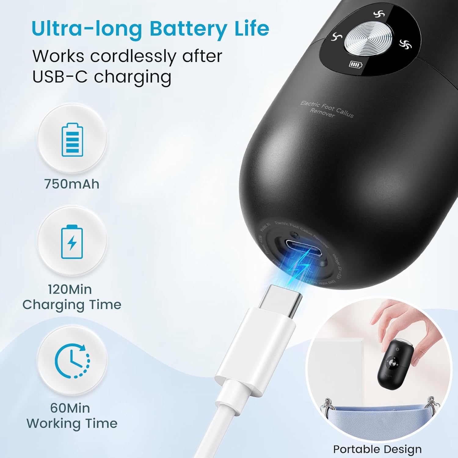 - Type-C Charging & Wireless Convenience: This electric foot callus remover comes with Type-C fast charging technology. Its smart display shows real-time battery levels, so you won’t be caught off guard by sudden shutdowns during use. What’s more, once charged, it works wirelessly and with its compact size, it’s easy to carry anywhere and using anytime.