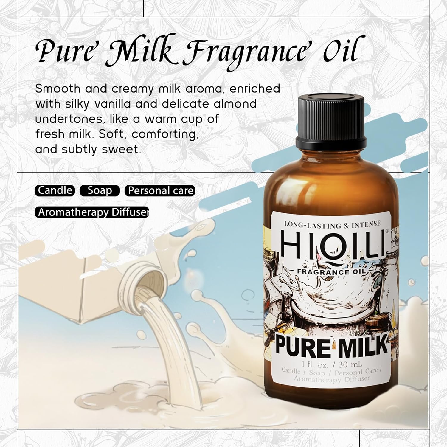 HIQILI Pure Milk Fragrance Oil for Home Diffuser, Ideal for Making Soap, Candles, Sugar Scrub, Skin & Body, Pet Safe - 1 Fl Oz