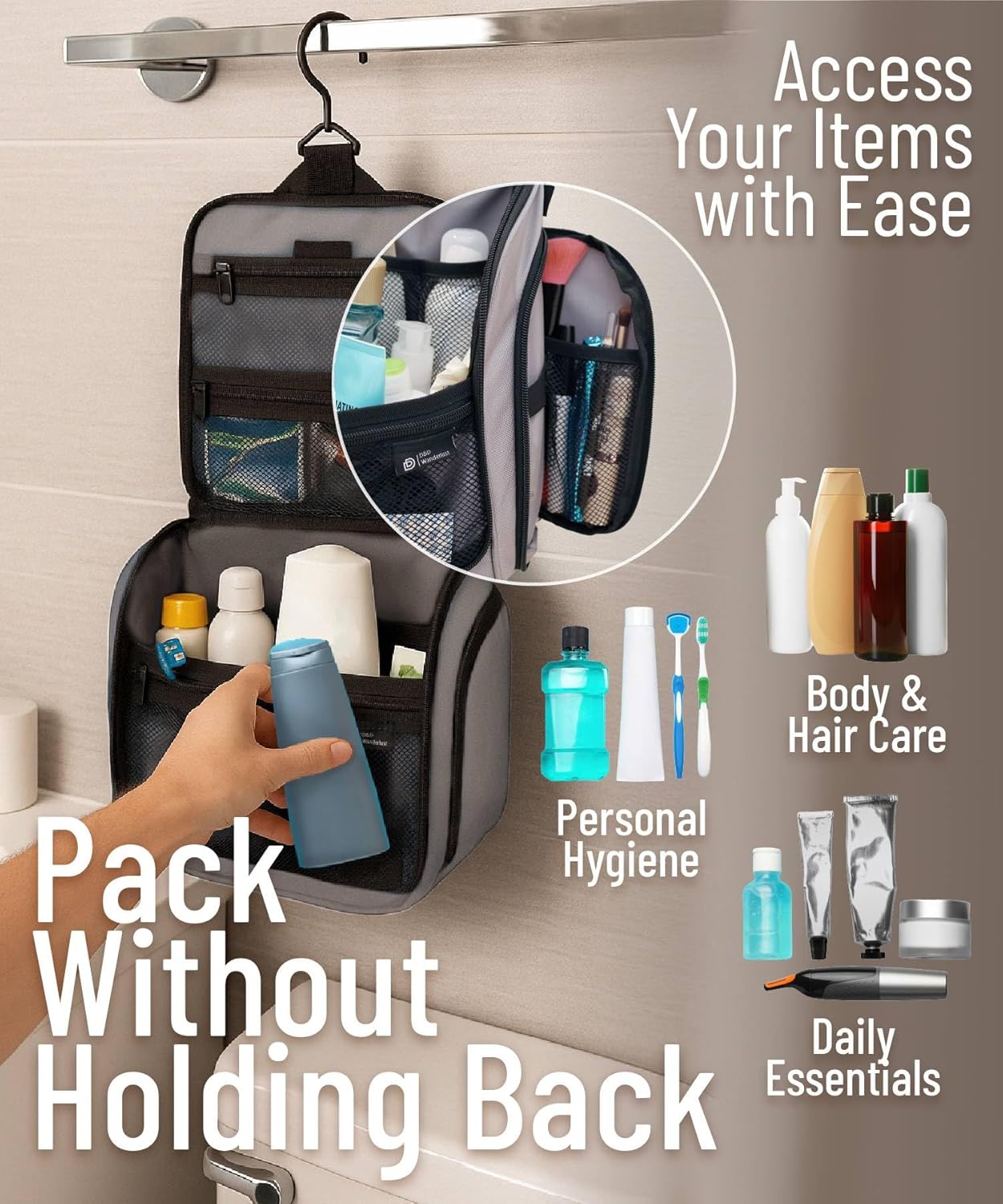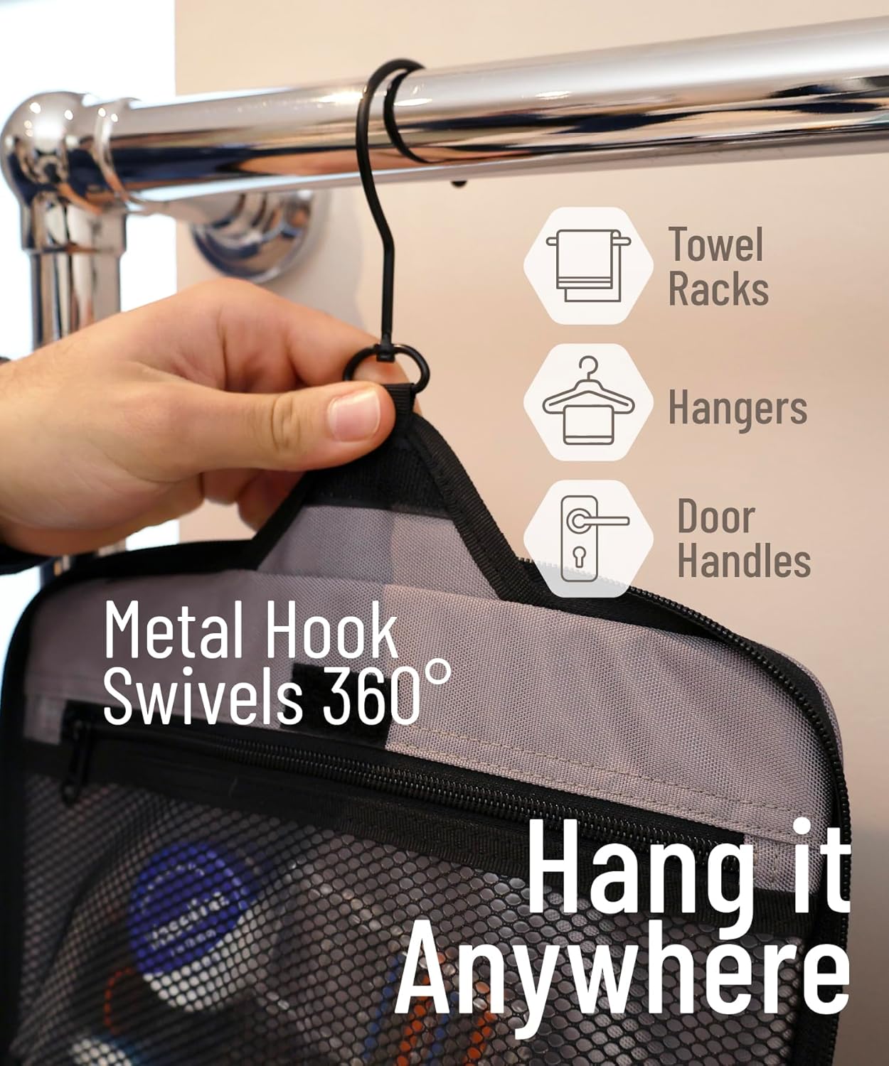 - Convenient Hanging Hook: The XXL metal swivel hook allows you to hang the bag anywhere, saving valuable counter space. It's perfect for use in hotels, bathrooms, or even on a camping trip.