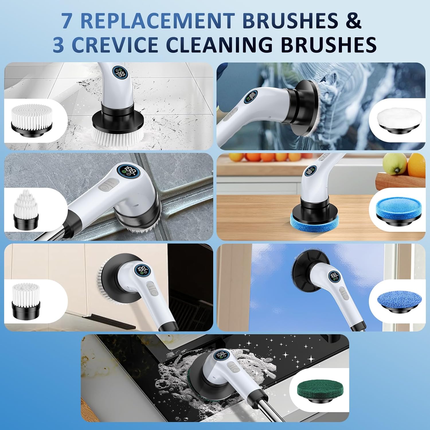 - 7 Multi-Functional Brush Heads: Our cordless scrubber includes 7 interchangeable heads for diverse cleaning needs. Perfect for tackling recessed areas like bathtubs and sinks, as well as narrow spots such as corners, crevices, floors, glass, tiled walls, car surfaces, wheels, seats, furniture, and stoves. Soft, high-quality bristles prevent scratches on tiles, glass, and car exteriors. The bathroom accessories widely used in kitchens, wooden and tiled floors, glass, tires, and cars