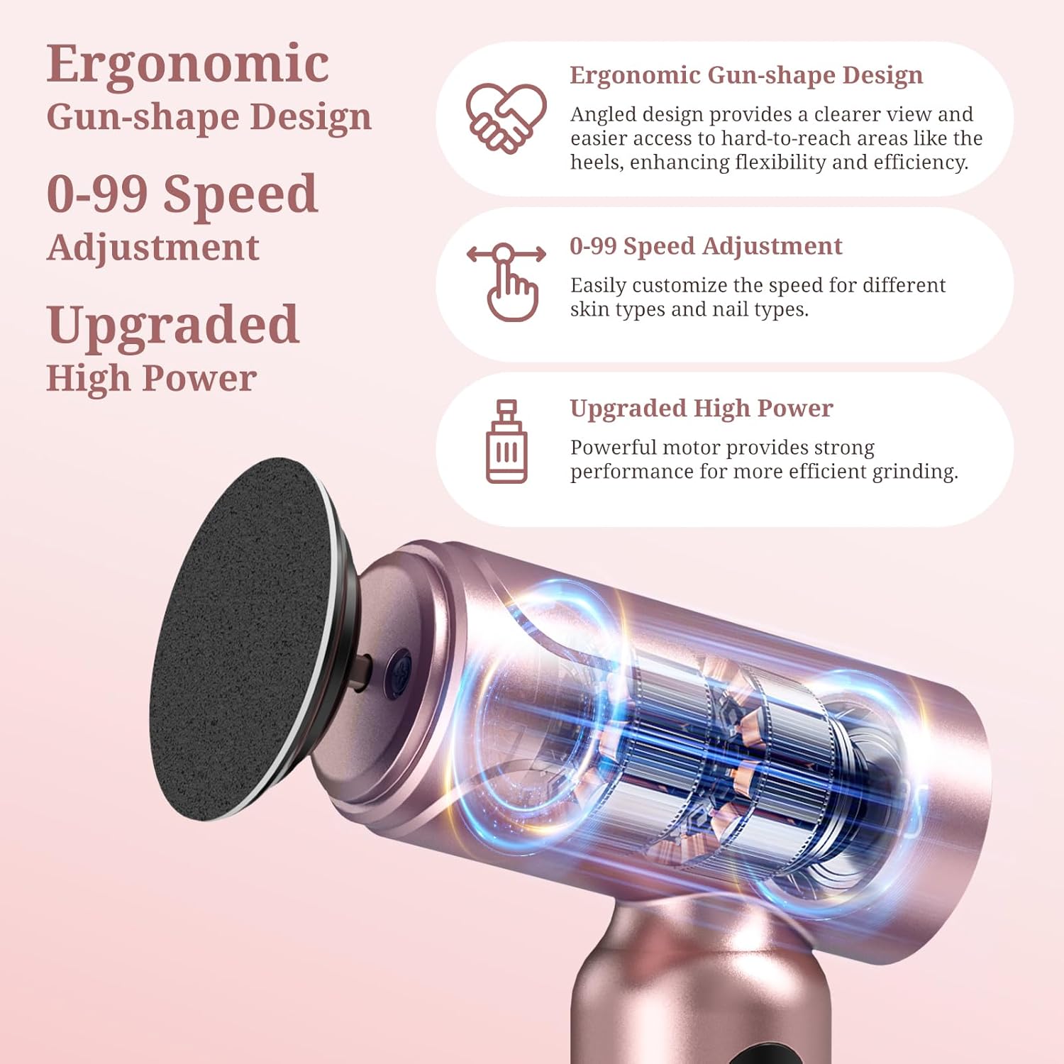 - [Gun-Shaped Design] Electric Foot Filer adopts a gun-shaped design. Compared with the straight-barrel design, the gun-style foot cuticle grinder is more labor-saving and easier to control in operation. Its ergonomic grip reduces hand fatigue during long use. The angled design also offers a clearer view while grinding, making it easier to reach and treat hard-to-access areas like the heels, making it more flexible and efficient. Give you a more professional foot care experience