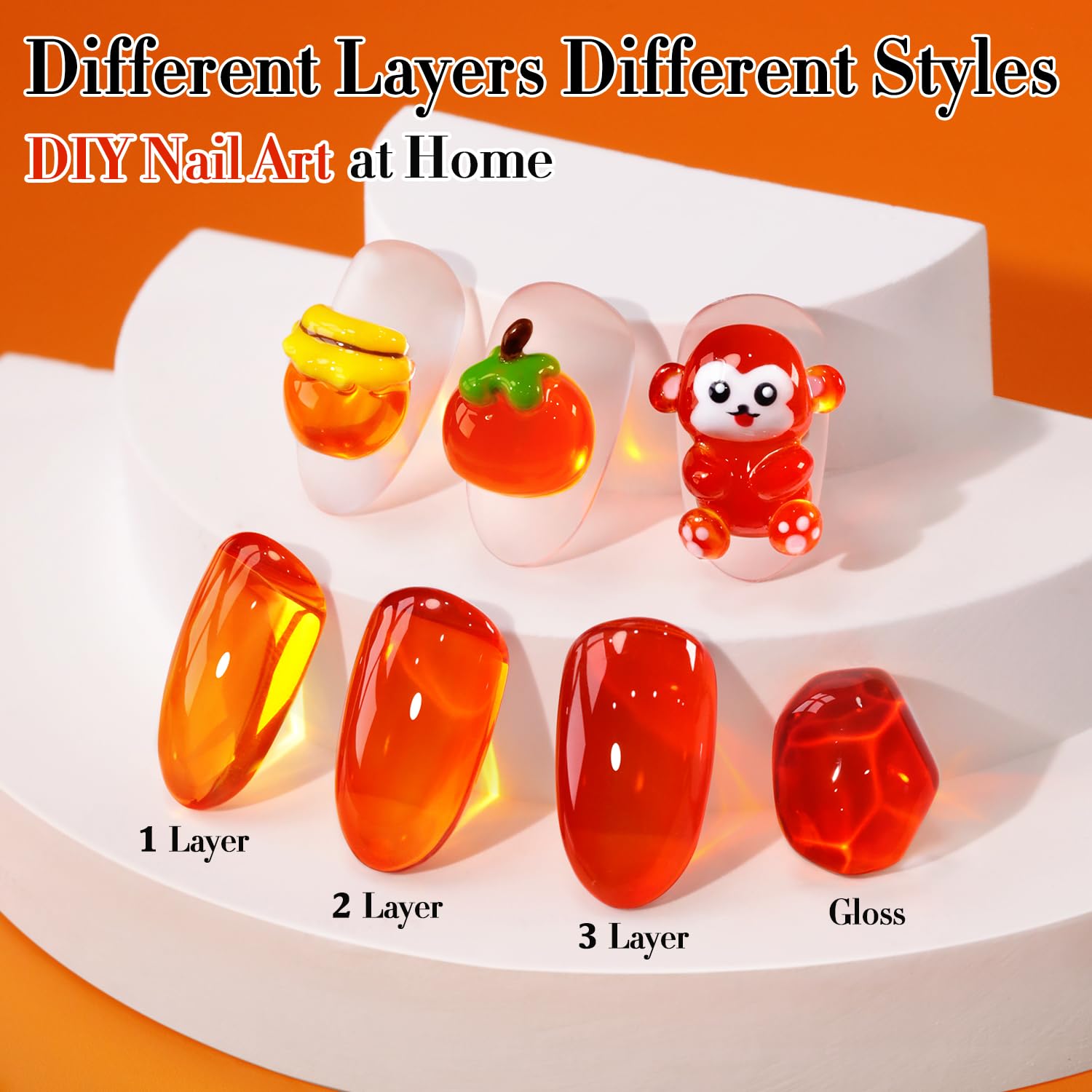 - Same Color Gel Same Color Bottle: 1 pc 15ml 0.5OZ Jelly Glaze gel polish,different layers with different effects,need to be cured under UV or LED Lamp for 60-120s. Must apply with Base Gel and Top Coat. Please shake the bottle or warm it with hot water before use, to acheive a better effect.