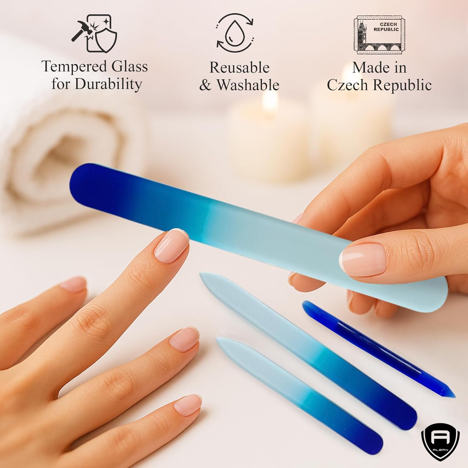 - Premium Czech Glass Craftsmanship: Each nail file is made from genuine Czech tempered glass, renowned worldwide for its strength, precision finish, and long-lasting performance. Designed to gently shape, smooth, and seal the nail edge without splitting or tearing.