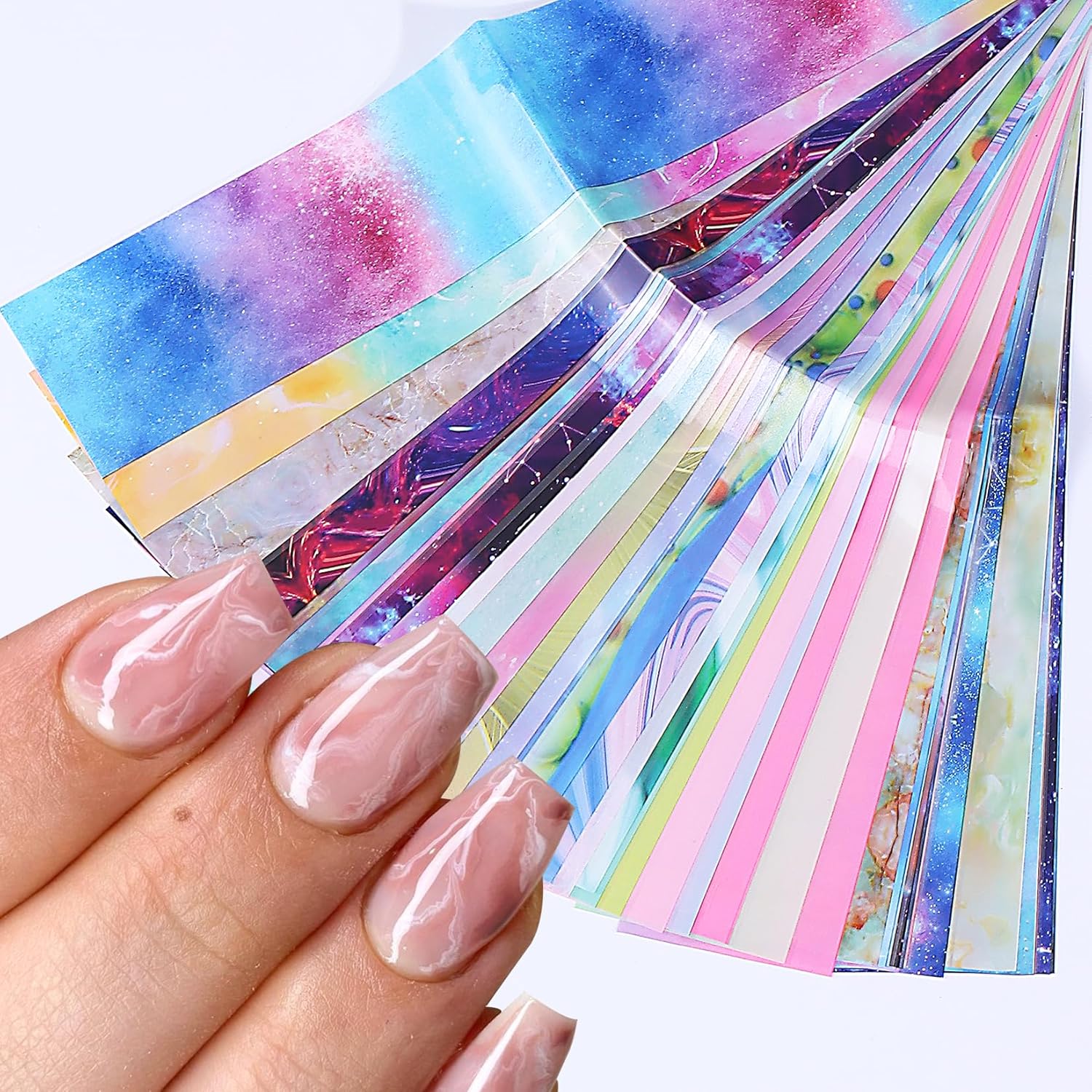 Nail Foils Transfer Nail Art 50PCS Holographic Starry Sky Stickers Marble Decals Nail Supplies Colorful Gradient Pink Blue Nail Art Foil Transfer Sheets Paper for Women DIY Designs Manicure Accessory